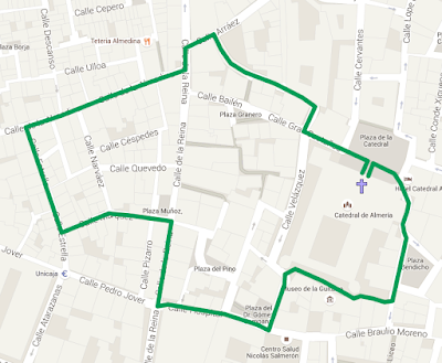 Plaza de la Catedral, General Castaños, José Ángel Valente, Plaza Campoamor, Arráez, La Reina, Almedina, Estrella, Márquez, Plaza Muñoz, Reina, Hospital, Los Duendes, Ronda del Beato Diego Ventaja, Pza. Cristo de Medinaceli, Olmos, Pza. Bendicho, Cubo, Plaza de la Catedral. Recogida a las 21:45 aproximadamente.