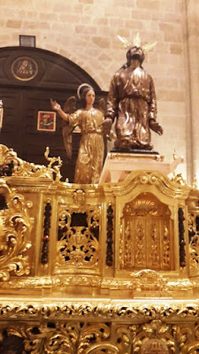 Finalmente, los portadores han acercado las andas ante el paso del Señor, donde esperaban cuatro de sus costaleros que han sido las personas que lo han elevado y entronizado definitivamente sobre el paso.