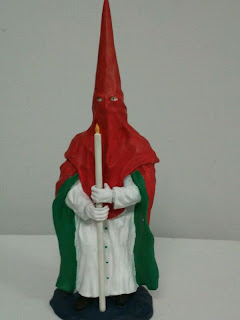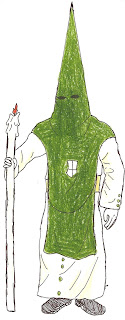 Antifaz verde con capirote alto y escapulario del mismo color.