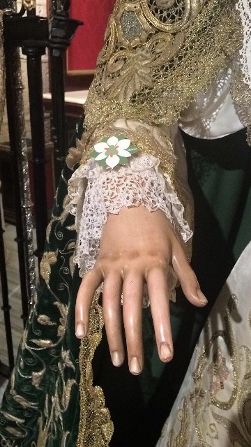 • Tocado: Compuesto por un encaje de bolillos color beige con motivos florales, con cuello de concha de oro del siglo XIX, donada recientemente. Puños de ganchillo en el mismo color