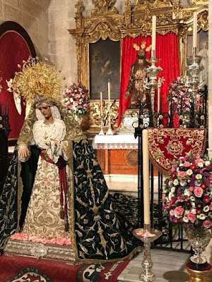 Para esta ocasión, la priostía y las camareras de la Virgen decidieron presentar a Ntra Sra. del Amor y la Esperanza vistiendo las siguientes prendas aderezadas por Juan Rosales: