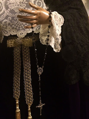 • Detalles: Rosario de azabache y plata con la imagen de la Virgen de la Fuensanta, del siglo XIX. Un broche con forma de ramillete de flores con piedras blancas.