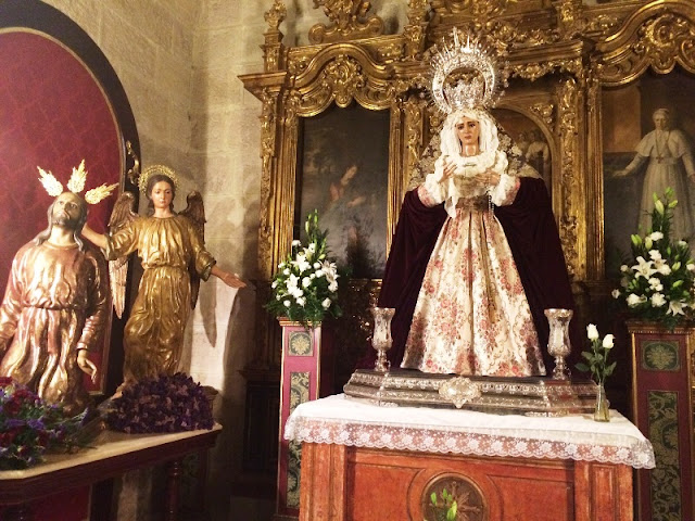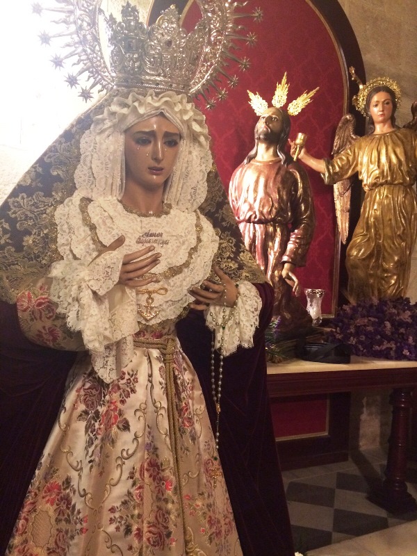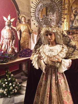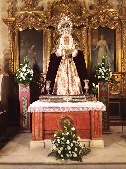 Para estos días de Tiempo Ordinario, la Virgen del Amor y la Esperanza ha sido vestida una vez más por D. Juan Rosales y sus priostes han preparado para esta ocasión las siguientes preseas y prendas en tonos rojos por la Candelaria: