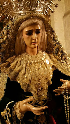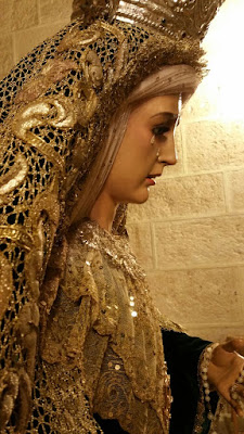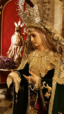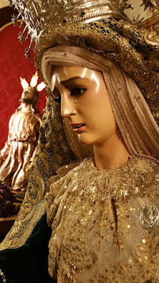 · Toca sobremanto (1986): Bordados de aplicación sobre malla dorada. Diseñada y bordada por D. Alfonso Reyes, de Salteras, (Sevilla).