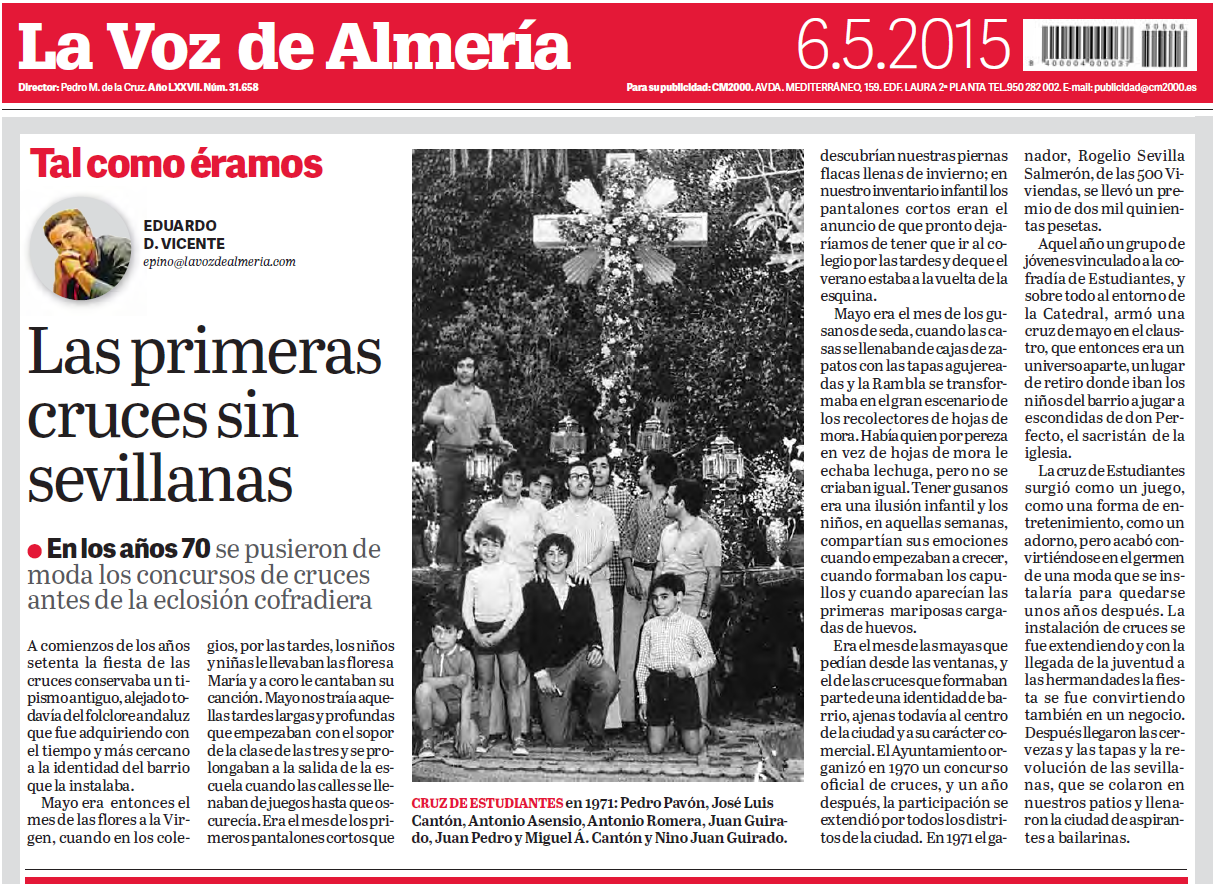 Aquel año un grupo de jóvenes vinculado a la cofradía de Estudiantes, y sobre todo al entorno de la Catedral, armó una cruz de mayo en el claustro, que entonces era un universo aparte, un lugar de retiro donde iban los niños del barrio a jugar a escondidas de don Perfecto, el sacristán de la iglesia.
