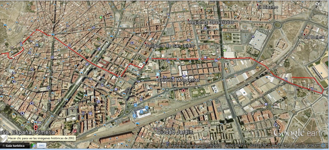 La hora de inicio del traslado será a las 16.30 aproximadamente y seguirá el siguiente itinerario de unos 3.400 m de recorrido: Camino de la Goleta, Carretera del Doctoral, Avenida Padre Mendez, Carretera de Ronda, Calle Dr. Ferranz, Calle Hermanos Pinzón, Calle Doctor Gregorio Marañon, Rambla Obispo Orbera, Puerta Purchena, Calle Navarro Darax, Plaza del Monte, Calle Marin, Calle Jovellanos, Calle Mariana, Calle Juez y Calle Milagro.